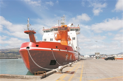 图为“雪龙2”号停靠在新西兰港口进行无接触补给。新华社发(孙晓桐摄)