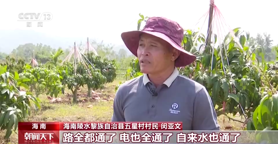 海南陵水黎族自治县五星村村民 闵亚文:路全都通了,电也全通了,自来水也通了。在村里,每个农民都是喜气洋洋的。