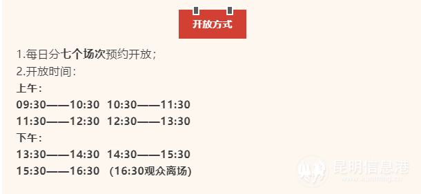 西南联大博物馆开放时间为每周二至周日上午9:30——16:30,闭馆前半小时不再入场,周一闭馆,国家法定节假日正常开放。每日分7个场次预约开放,上午4场,下午3场。上午4场开放时间为:9:30——10:30,10:30——11:30,11:30——12:30,12:30——13:30;下午3场开放时间为:13:30——14:30,14:30——15:30,15:30——16:30。