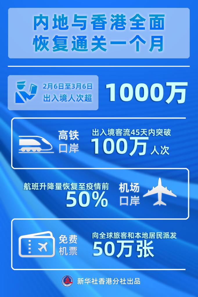 各个口岸恢复通关服务以来,出入境客流呈现稳步上升态势。香港特区政府入境事务处数据显示,自2月6日全面通关一个月来,香港出入境总人次突破千万。