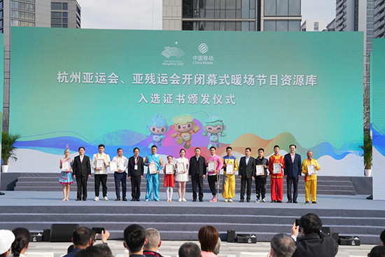 活动现场,与会领导为进入杭州亚运会、亚残运会开闭幕式暖场节目资源库的优秀节目颁发证书,全省11地市代表上台接受证书。(作者:记者 楼子璇/文 方建飞/图)