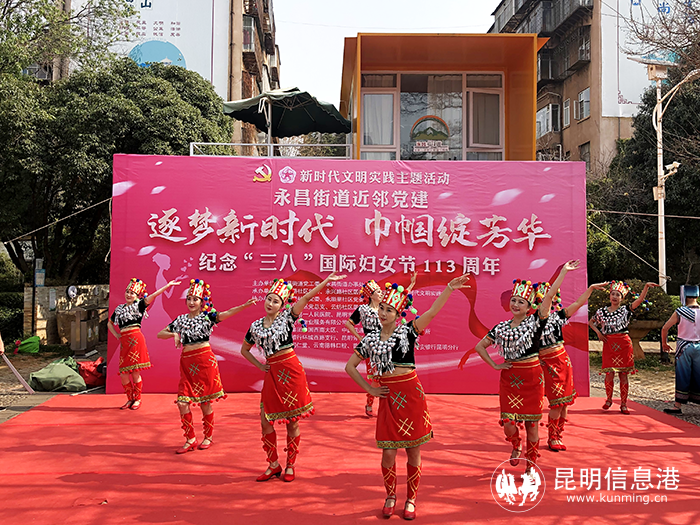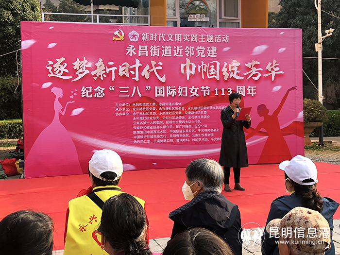 昆明信息港讯 记者曹月 在“三八”妇女节来临之际,3月6日上午,永兴路社区在永昌小广场开展了“逐梦新时代 巾帼绽芳华”主题活动 。永昌街道6家近邻党建社区妇女、群众、永兴路社区共建单位代表等160余人参加活动。