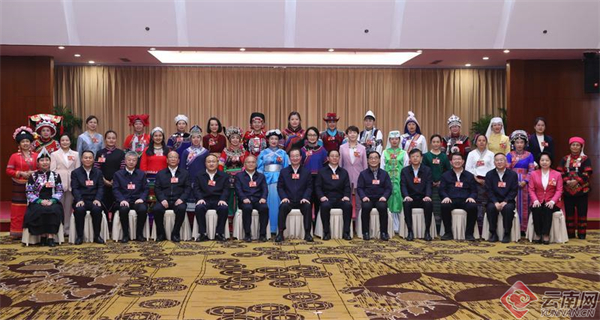 云南省代表团30位女代表、9位女工作人员、2位女记者中有29名少数民族同志,大家身着绚丽的民族服装共同庆祝自己的节日,成为一道靓丽的风景线。女代表们一起唱起《唱支山歌给党听》等歌曲,欢乐的歌声和灿烂的笑容充满现场,传递着大家节日的喜悦心情和高涨的履职热忱。