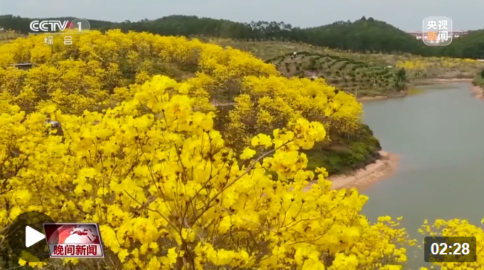 同样,在广东省肇庆市800多亩黄花风铃木,迎风绽放,犹如一片黄金花海。一朵朵风铃状的花朵簇拥成球,与绿水青山相映成趣,吸引了不少游客前来打卡拍照。