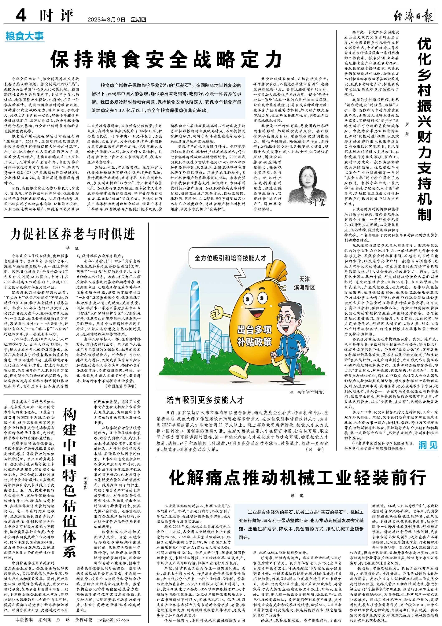 今年全国两会上,粮食问题再次成为代表委员热议的话题。粮食问题之所以“热”,是因为关系中国14亿多人的吃饭问题。在国际环境日趋复杂的情况下,要端牢中国人的饭碗,确保消费者吃得饱、吃得好,不是一件容易的事情。我国必须冷静对待粮食问题,保持粮食安全战略定力,稳中求进,积极作为,把粮食产量产能一起抓,确保今年粮食产量继续稳定在1.3万亿斤以上,为全年粮食保供稳价奠定基础,为全年经济增长目标的实现提供重要支撑。