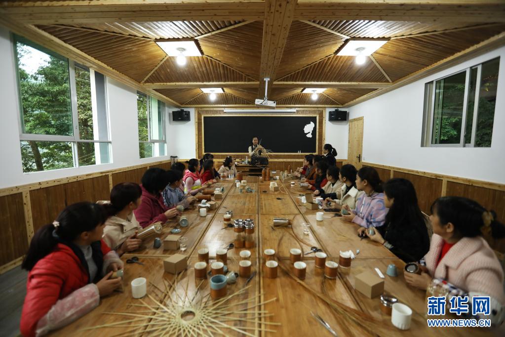 2020年11月5日,在贵州省赤水市大同镇竹编非遗产学研基地,杨昌芹(中)在指导学员学习竹编。新华社发(王长育 摄)