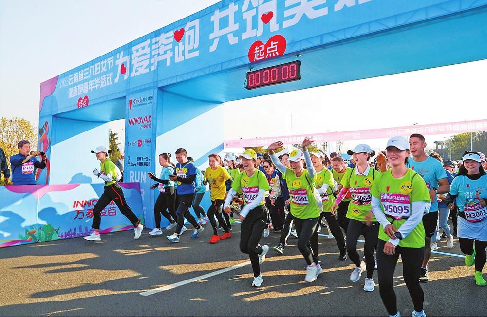 3月8日,为“爱”奔跑·共筑美好“三八”国际妇女节云南省健康跑嘉年华在昆明草海隧道公园开跑。赛事邀请各跑团代表、知名跑友以及社会各行业数百位热爱运动的女性参与,500名跑步爱好者踏上滇池绿道,一边健康奔跑,一边欣赏着春天的滇池风景。