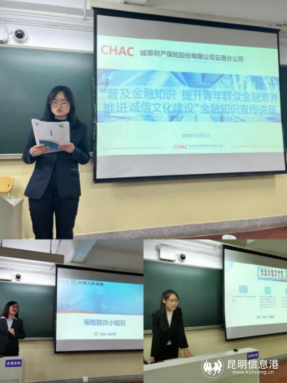 近日,诚泰保险云南分公司联合人保财险云南分公司、天安财险云南分公司、大家财险云南分公司共同走进云南财经大学金融学院保险专业21级,开展“共筑诚信消费环境 提振金融消费信心”主题宣讲活动。