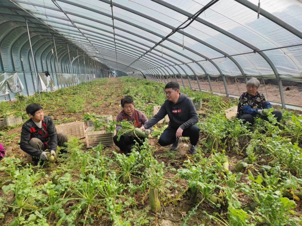 张立华(右二)和村民在收萝卜。(受访者供图)