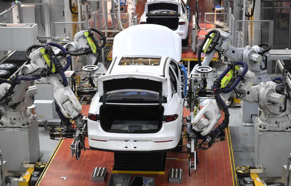 △广州一家新能源汽车生产线,机器人手臂在安装汽车轮胎。