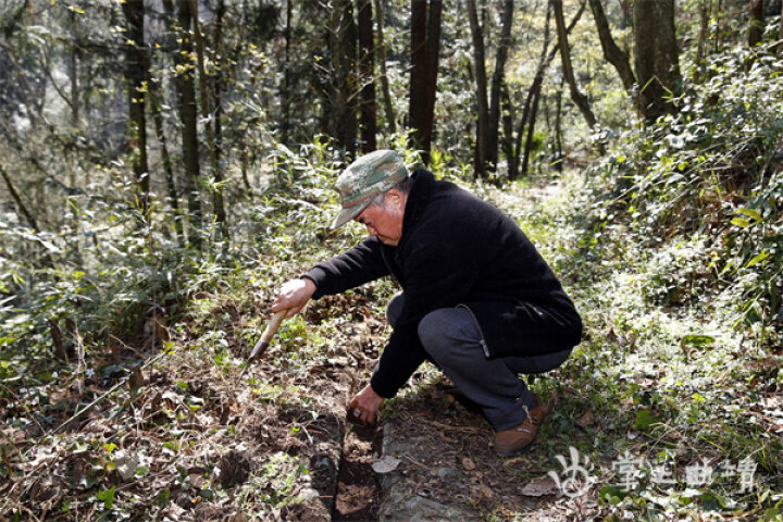 春日里的山核桃箐林深叶茂、古树参天、绿水潺潺。已经干了20多年护林员的彭云生,熟悉这里的一草一木,也与这片山林结下了深厚的情感,他用手轻轻扒开地上的落叶,指着露出地面一条似石中带“槽”的东西说这就是他所说的“石卷槽”。