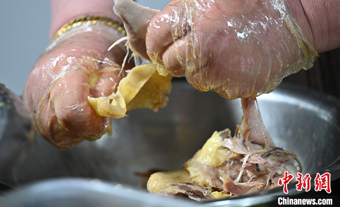 “一天煮一锅,水开后放入花椒、生姜、咸盐,去腥味增香味,我家一锅炖煮80只鸡,足足需要5个小时,刚好到午饭的时候出锅。”每天清晨,沙飞和李霞就开始在店里忙活。