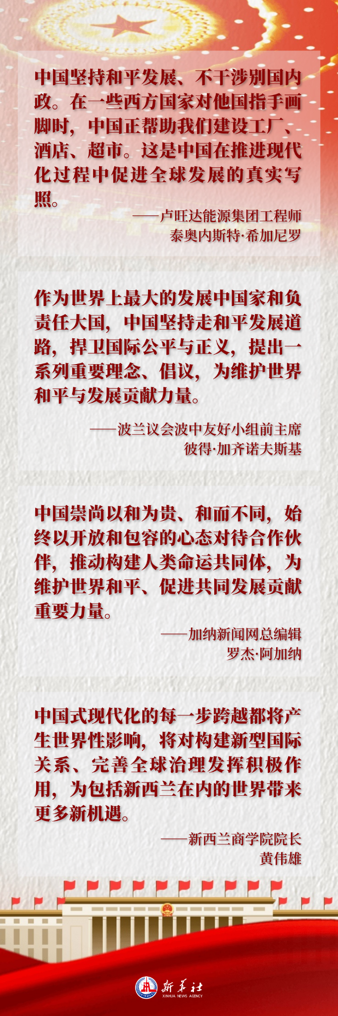“中国为世界带来很多机会。在非洲,很多国家都从中方建设的基础设施项目中受益。”卢旺达能源集团工程师泰奥内斯特·希加尼罗指出:“中国坚持和平发展、不干涉别国内政。在一些西方国家对他国指手画脚时,中国正帮助我们建设工厂、酒店、超市。这是中国在推进现代化过程中促进全球发展的真实写照。”