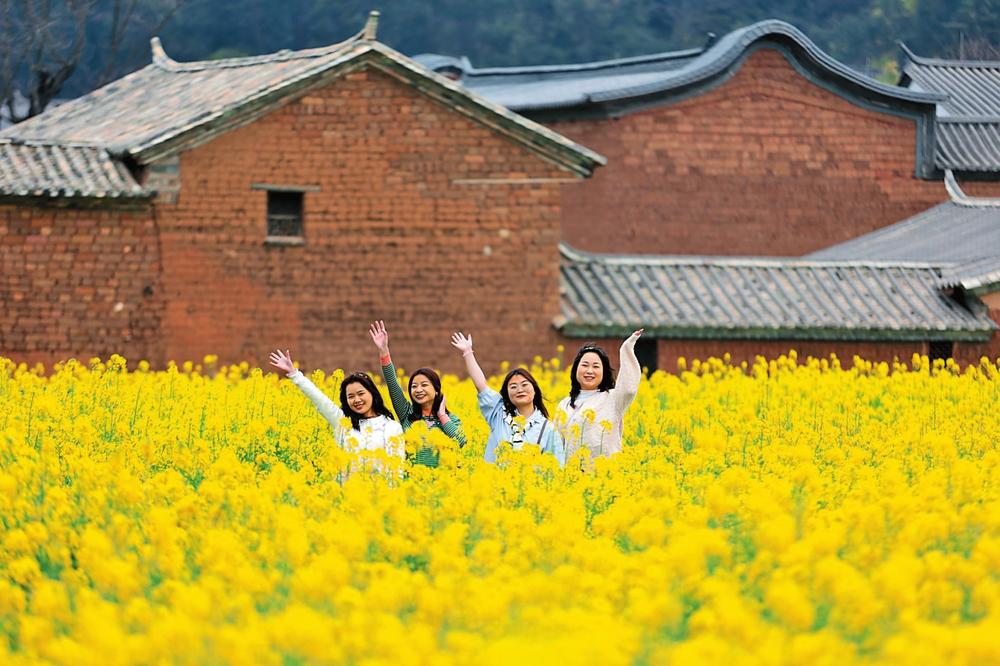 眼下,已进入花期的6.6万平方米油菜花海为古渔村增色不少。灿烂春色里,来这里赏花打卡,田园与古村同框,便又多了些艺术和生活的气息。(云南日报 记者陈飞 实习生李嘉琪 摄)