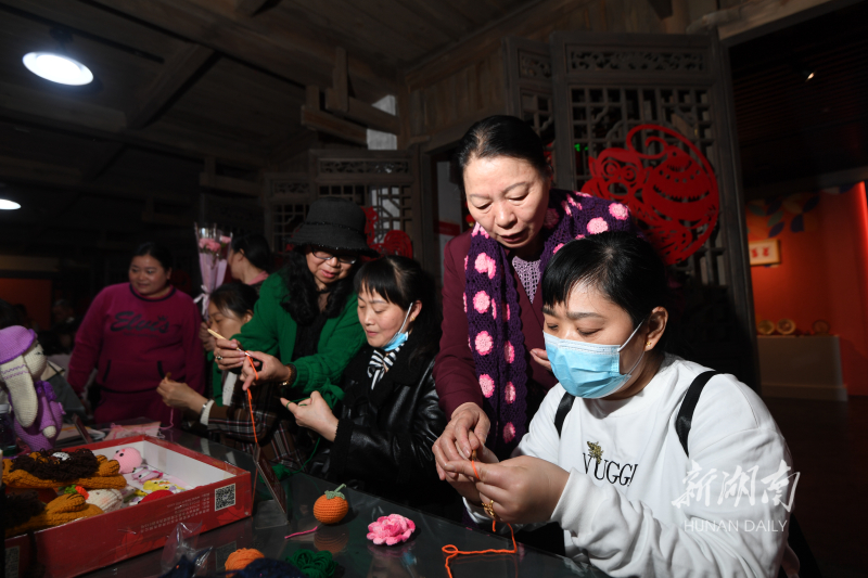 3月8日,长沙非物质文化遗产馆,女同胞们在体验非遗项目——欧氏手工钩编。