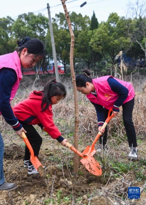 3月8日,在长兴县李家巷镇青草坞村的荒地上,孩子们在老师和志愿者的带领下种下乌桕树苗。