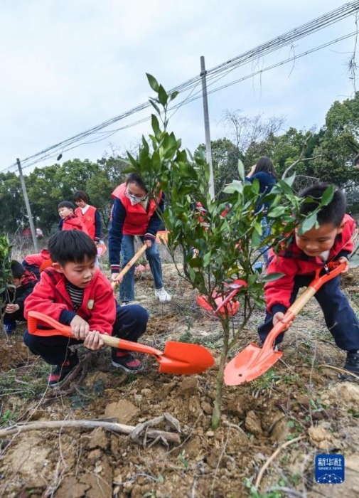 3月8日,在长兴县李家巷镇青草坞村的荒地上,孩子们在老师和青草坞村党员志愿者的带领下一起种下橘子树苗。