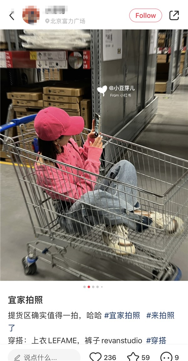 据了解,网红博主到宜家等地打卡的现象十分常见,包括仓库区、货物区、餐厅等地都为常见背景。博主们在镜头前展现各种姿势,并发布如“摆拍姿势大全”“氛围感照片怎么拍”“宜家拍照小技巧”等内容,有些博主甚至还坐进了购物车、储物柜内,对周围顾客也造成了一定困扰。有网友说,有人坐着、趴着,还有人带几套衣服来换,拍很久。也有网友称,“挡到我取货,然后脸色还不太好看,觉得你妨碍她了。”
