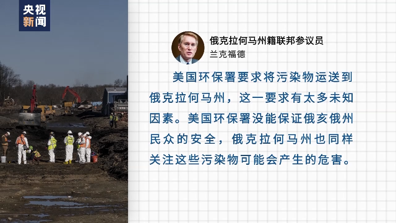 俄克拉何马州籍联邦参议员兰克福德也在一份声明中说:“美国环保署要求将污染物运送到俄克拉何马州,这一要求有太多未知因素。美国环保署没能保证俄亥俄州民众的安全,俄克拉何马州也同样关注这些污染物可能会产生的危害。”