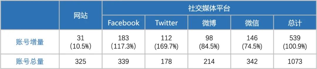 二是增加媒体矩阵信息。近年来,海外华文传媒在新媒体领域业务不断发展,在已有账号平稳运营的基础上,加大新媒体平台布局力度,搭建多平台多账号传播矩阵。项目组于2022年12月结合前期调研情况,对各华文媒体的传播矩阵进行了排查和更新,补充了各平台多账号信息,经迭代,榜单项目目前监测的账号总量达1073个,较迭代前(530个)扩容101%,总共持续观察1398个网站和社交媒体账号。新增网站与账号数据均已纳入本次榜单数据聚合和计算之中。