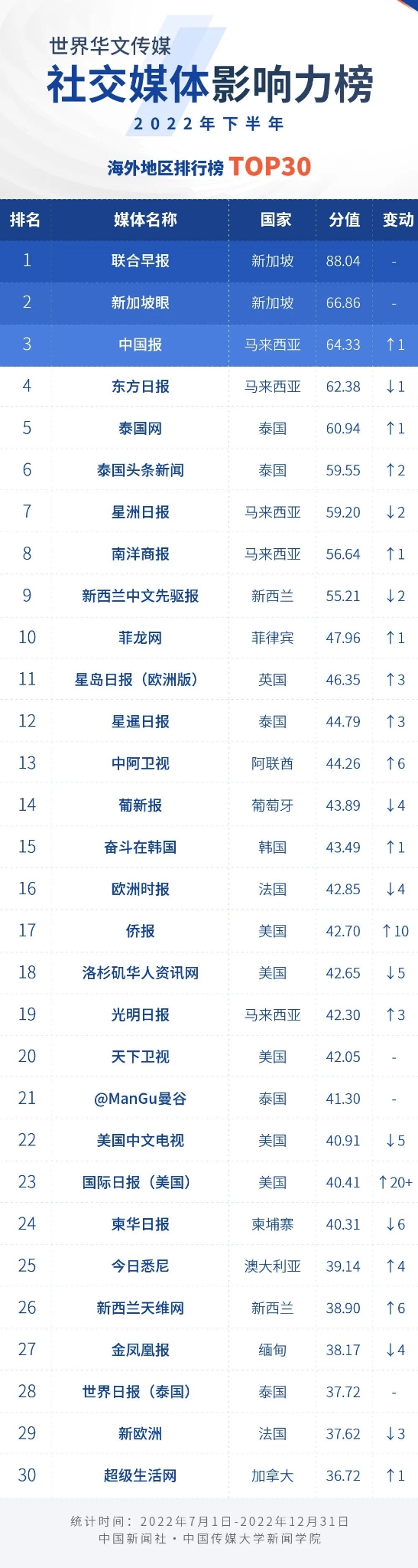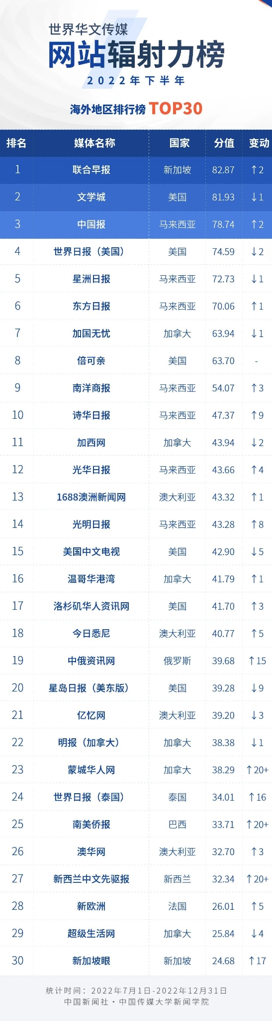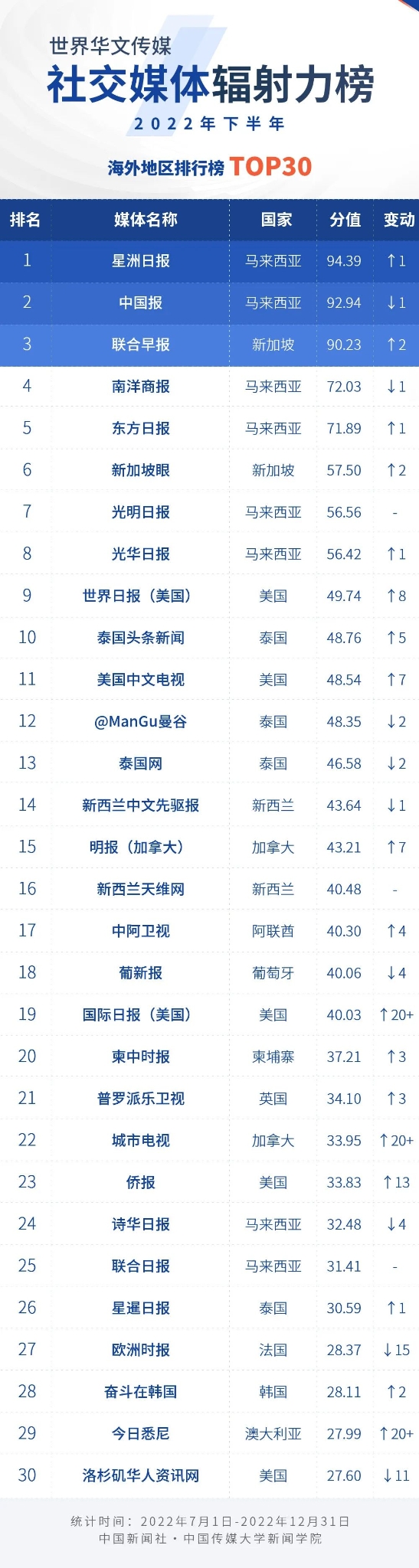 中国新闻社与中国传媒大学新闻学院持续开展“世界华文传媒新媒体影响力”测评项目,现根据2022年下半年世界华文传媒新媒体的业务数据,发布2022年下半年榜。