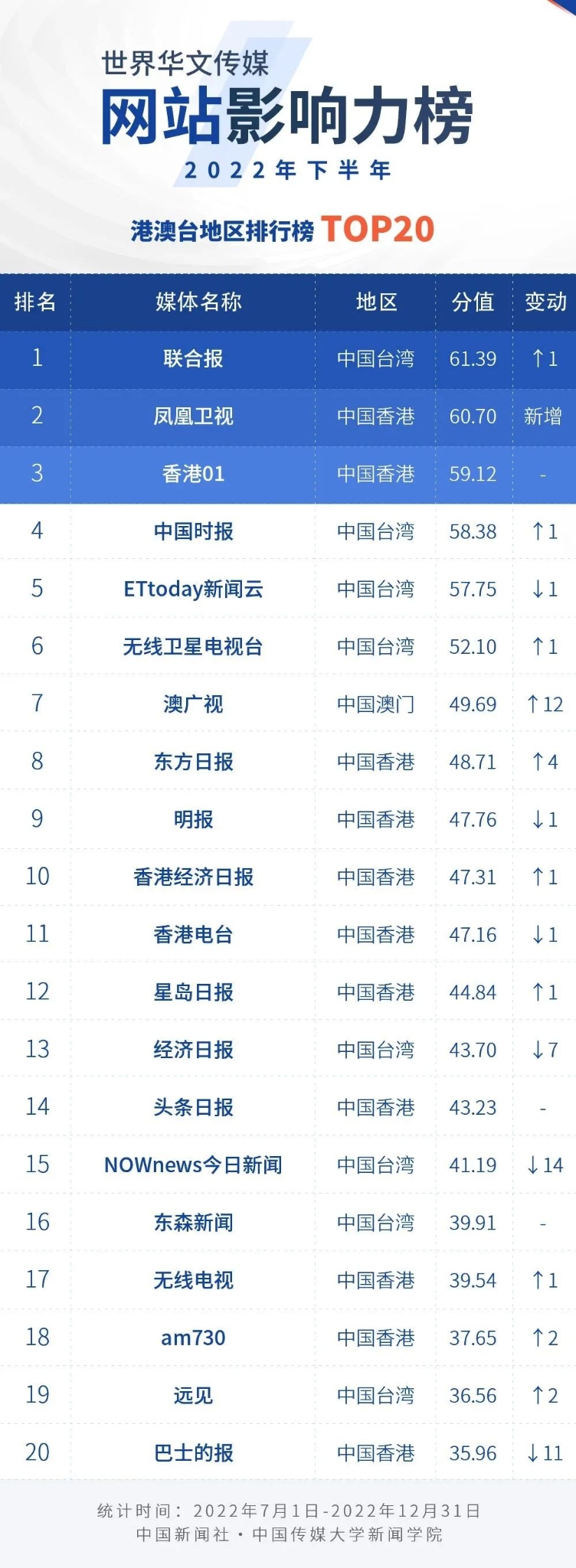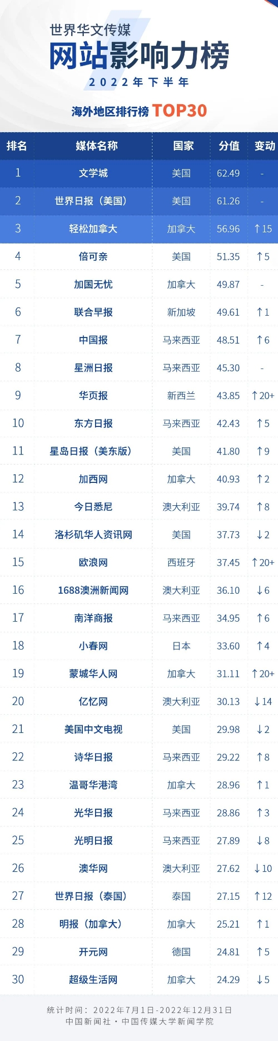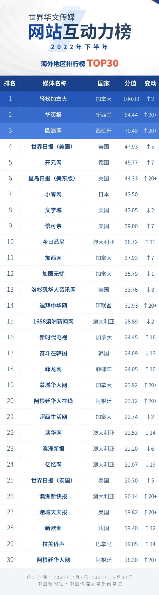 中国新闻社与中国传媒大学新闻学院持续开展“世界华文传媒新媒体影响力”测评项目,现根据2022年下半年世界华文传媒新媒体的业务数据,发布2022年下半年榜。