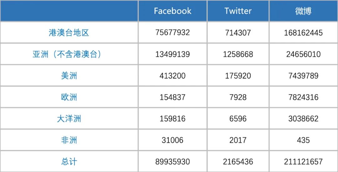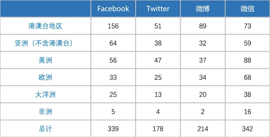 社交媒体方面:Facebook与微信是目前华文媒体布局较为广泛的平台,其中Facebook是亚洲华文传媒最主要的布局平台,微信则是其余各大洲华文媒体更加侧重的平台。