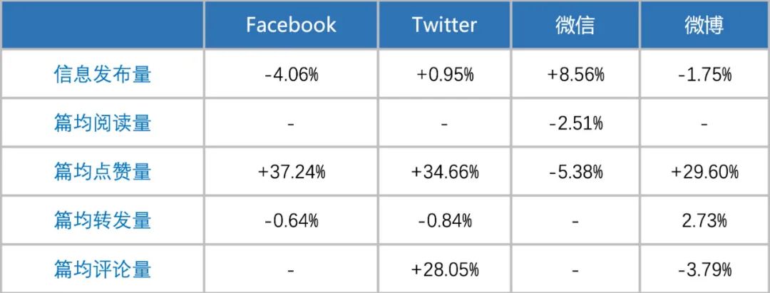 与2022年上半年相比,各华文传媒在社交平台多项互动指标有较为明显的增长。在Facebook与微博平台,各华文传媒虽然信息发布量有所下降,但篇均点赞量数据增长明显;在Twitter平台,信息发布量小幅增长的同时,篇均点赞量、评论量均出现较大幅度提升;华文传媒在这三个平台的内容产出更为优质,传播效能更为良好。相比之下,微信平台虽然发文量有所提升,但主要动力指标数据均有下降,内容产出质量有待进一步提升。
