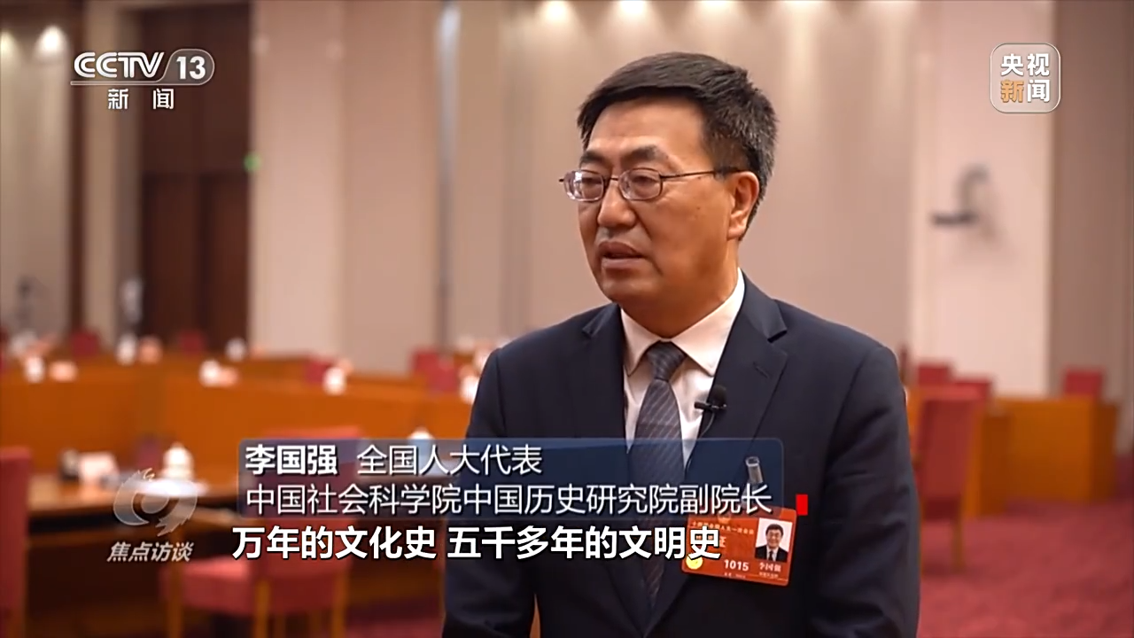 全国人大代表、中国社会科学院中国历史研究院副院长李国强:“中国的考古学实证了我们国家百万年的人类史,万年的文化史,五千多年的文明史,在新的时代我们要传承好中华文明,从中华文明中汲取智慧开创未来。”
