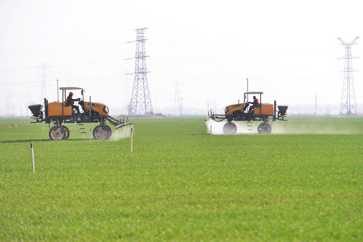 河北省晋州市槐树镇北白水村一家农业合作社的社员操作农业机械给冬小麦喷洒农药(2023年3月14日摄)。新华社记者 杨世尧 摄