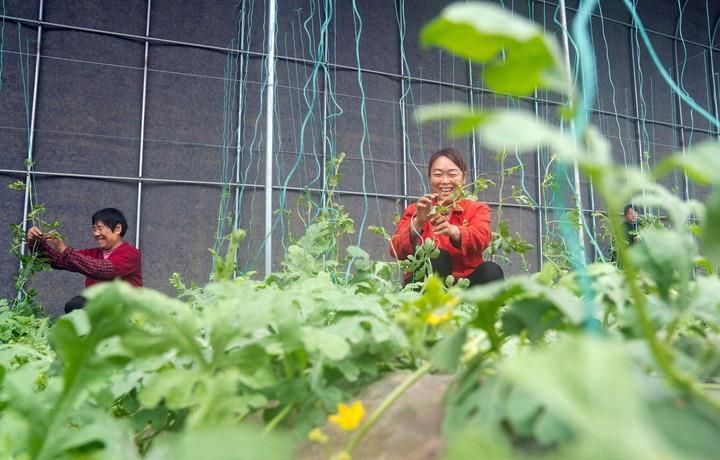 农户在河北沧州渤海新区黄骅市一处农业科技示范园为西瓜秧整枝(2023年2月11日摄)。新华社记者 骆学峰 摄