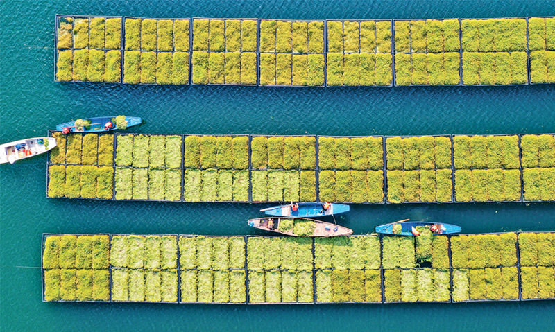 浙江省杭州市淳安县在千岛湖典型库湾、入湖口等区域,运用生态浮岛水上无土栽培技术种植水生蔬菜,努力探索“两山”价值转化新路径。图为2023年2月21日,工作人员正在采摘水生蔬菜。 人民图片 杨波/摄