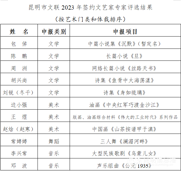 11位文艺家被评选为昆明市文学艺术界联合会2023年签约文艺家人选