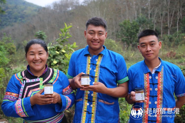 倒淌箐的村民手捧着护象蜂蜜,最左为张江美