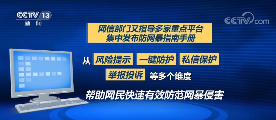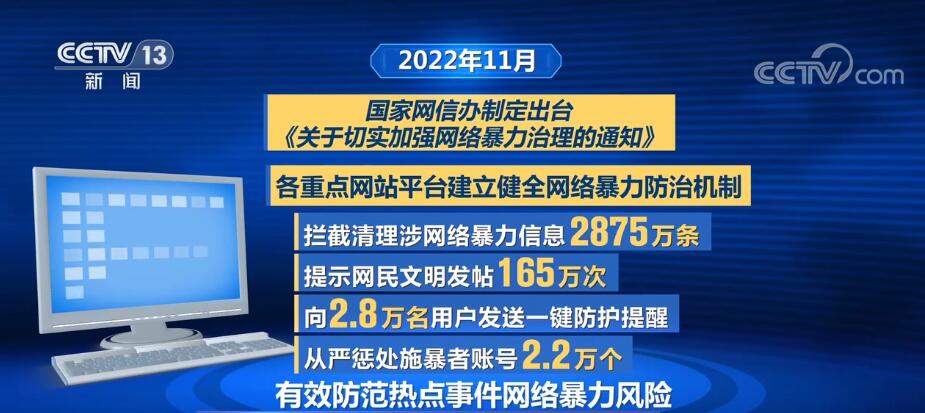 发布会上网信办相关负责人介绍说,2022年11月,国家网信办制定出台了《关于切实加强网络暴力治理的通知》,各重点网站平台建立健全网络暴力防治机制,拦截清理涉网络暴力信息2875万条,提示网民文明发帖165万次,向2.8万名用户发送一键防护提醒,从严惩处施暴者账号2.2万个,有效防范热点事件网络暴力风险。近日,网信部门又指导多家重点平台集中发布防网暴指南手册,从风险提示、一键防护、私信保护、举报投诉等多个维度,帮助网民快速有效防范网暴侵害。后续,网信部门将持续督促网站平台切实履行网暴治理主体责任,定期发布网暴防治情况,及时曝光典型案例,维护广大网民的合法权益。