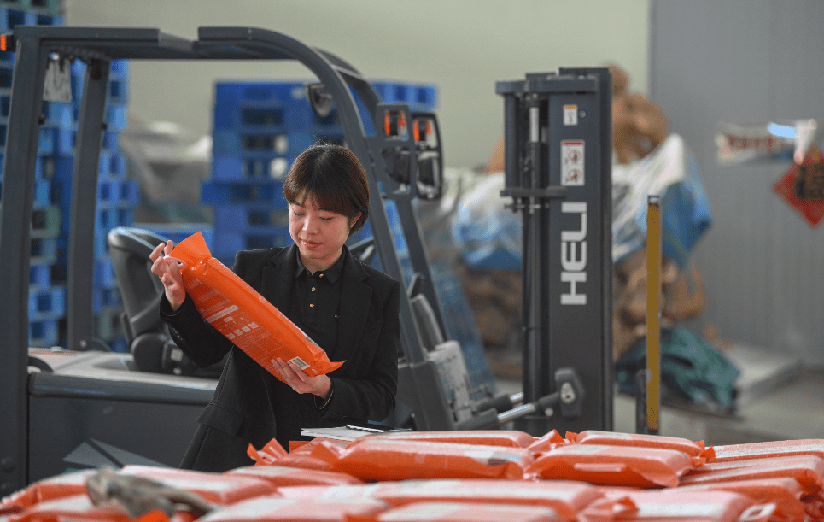 张建芳正在检查产品。(新华社记者孙凡越摄)