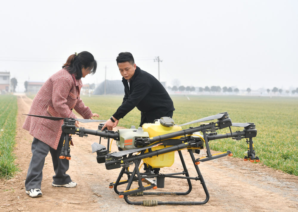 在陕西省宝鸡市陈仓区慕仪镇齐西村的农田,齐叶叶(左)与齐昆调试植保无人机(2023年2月27日摄)。新华社记者 张博文 摄