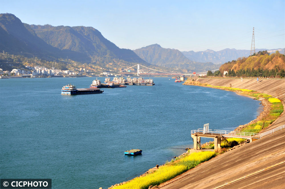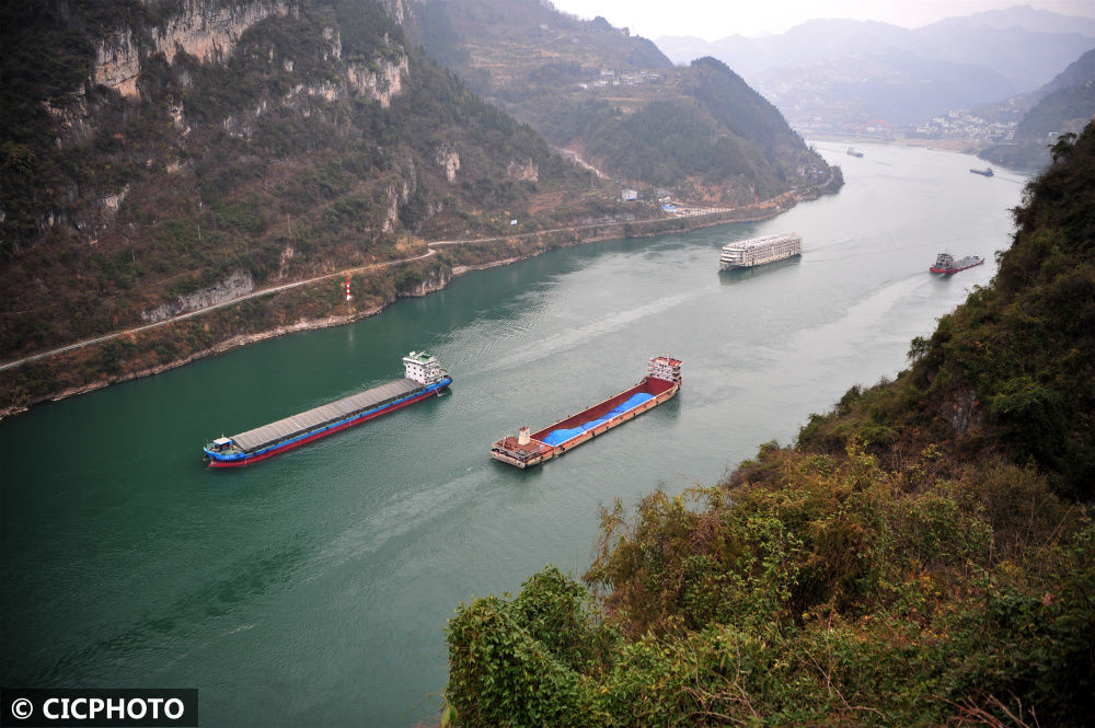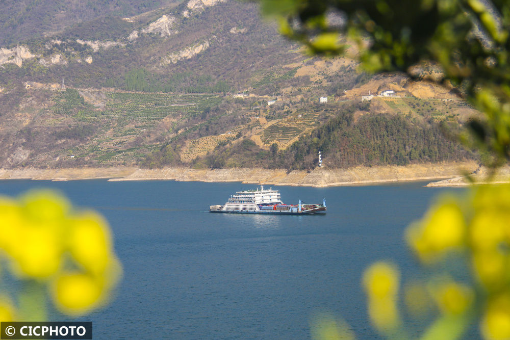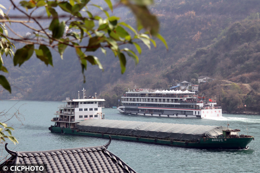 ↑2023年3月13日,船舶行驶在长江重庆市巫山县曲尺乡水域。CICPHOTO/卢先庆 摄