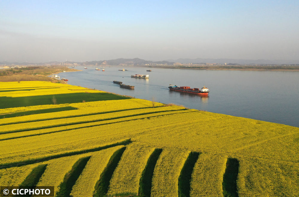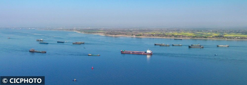 ↑2023年3月15日,船舶行驶在长江安徽省安庆市宿松县水域。(无人机照片)CICPHOTO/李龙 摄