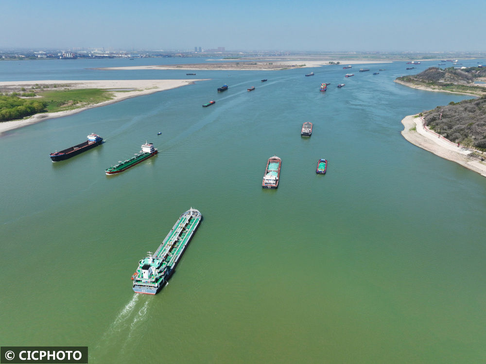 ↑2023年3月14日,船舶行驶在长江安徽省芜湖市鸠江区四褐山段水域。(无人机照片)CICPHOTO/王玉实 摄