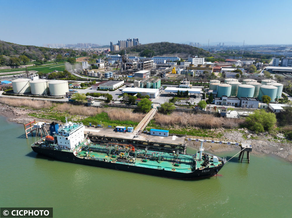 ↑2023年3月14日,安徽省芜湖市鸠江区长江南岸一处沥青码头,一艘货船靠泊在码头进行沥青卸船作业。(无人机照片)CICPHOTO/王玉实 摄