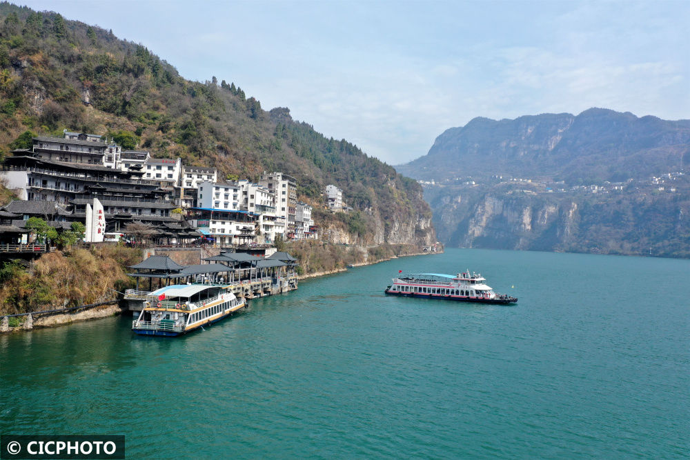 ↑2023年3月7日,湖北省宜昌市夷陵区三斗坪镇三峡人家风景区水域,游轮陆续驶入一处码头载客。(无人机照片)CICPHOTO/张国荣 摄
