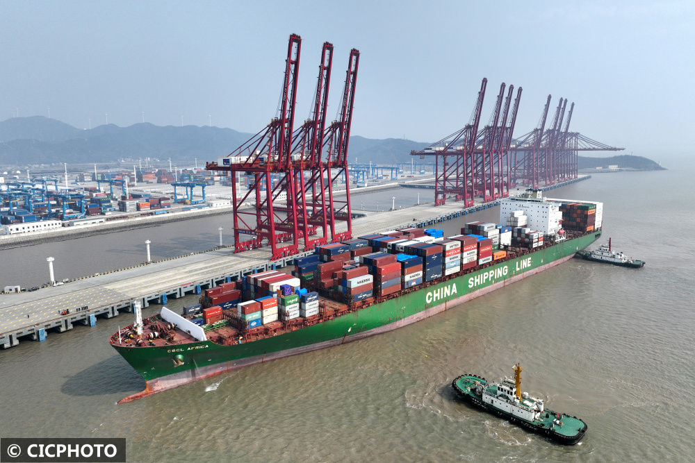 ↑2023年3月1日,一艘货轮在靠泊宁波舟山港金塘港区大浦口集装箱码头3号泊位。(无人机照片)CICPHOTO/姚峰 摄