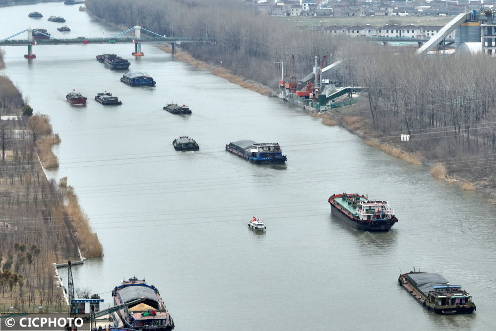 ↑2023年2月22日,货船行驶在京杭大运河江苏省扬州市宝应县水域。(无人机照片)CICPHOTO/沈冬兵 摄