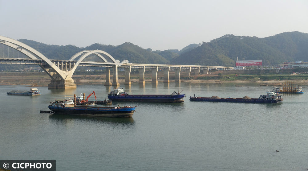 ↑2023年2月16日,货船行驶在西江广西梧州市水域。CICPHOTO/廖祖平 摄