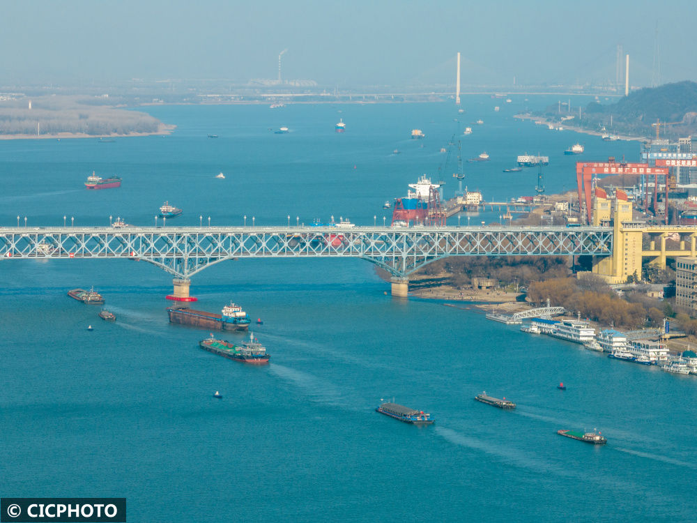 ↑2023年1月29日,船舶行驶在长江江苏省南京市水域。(无人机照片)CICPHOTO/杜懿 摄