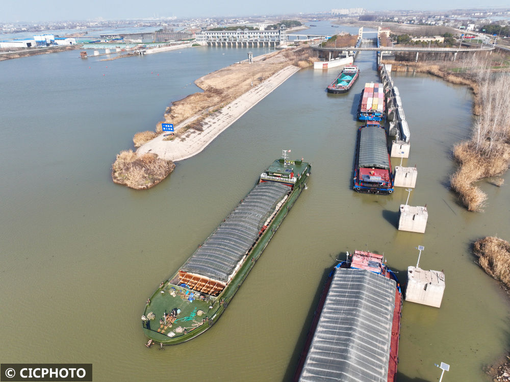 ↑2023年1月21日,货船有序通过安徽省芜湖市鸠江区合裕线航道裕溪船闸。(无人机照片)CICPHOTO/王玉实 摄