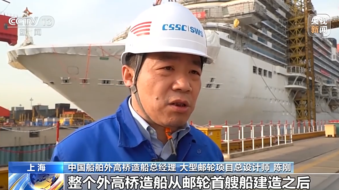 中国船舶外高桥造船总经理 大型邮轮项目总设计师 陈刚:整个外高桥造船从邮轮首艘船建造之后,民船和海工装备的产出是没有减少的。通过邮轮首艘船的建造,引领我们核心竞争力的提升,能够在国际市场上抢到更多的民船订单。