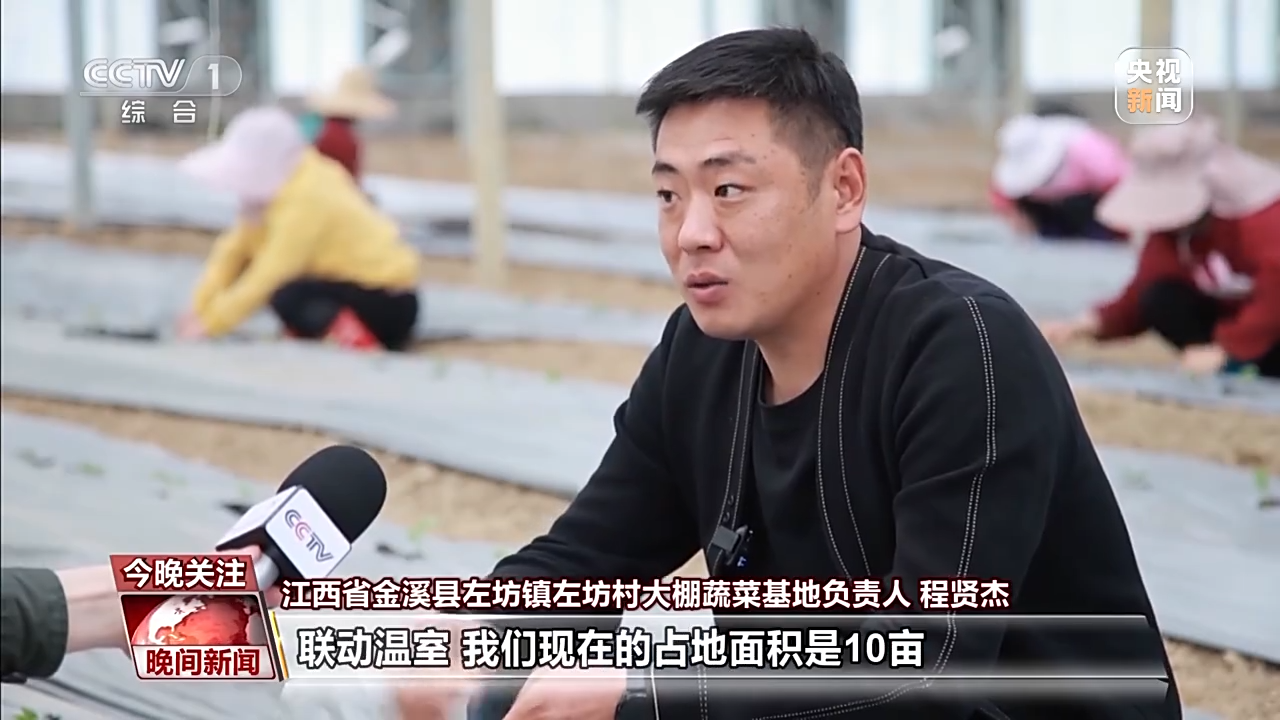 江西省金溪县左坊镇左坊村大棚蔬菜基地负责人 程贤杰:我们现在种的是白玉黄瓜,联动温室,我们现在的占地面积是10亩,这只是我们一小部分。