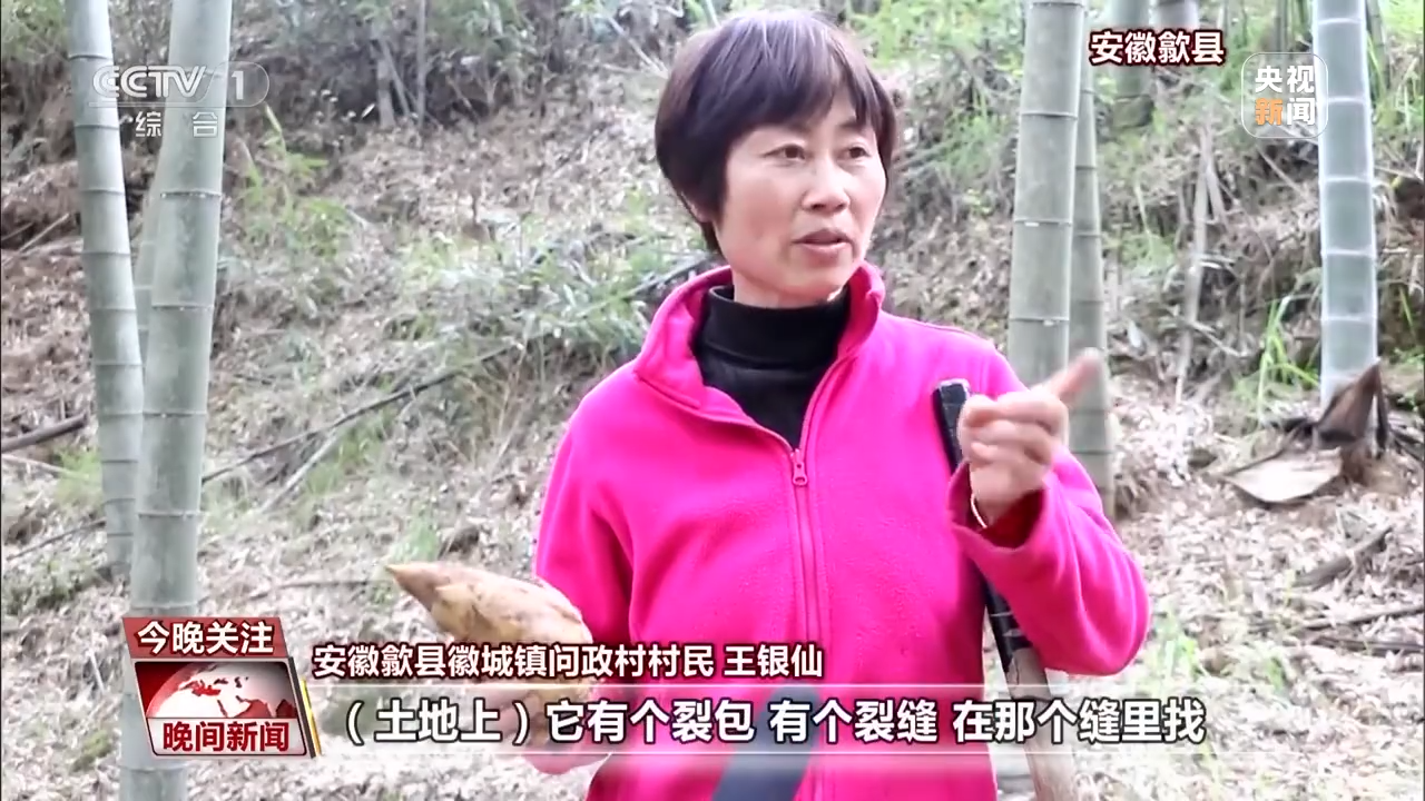 安徽歙县徽城镇问政村村民 王银仙:春笋快要出来的时候,土地上它有个裂包,有个裂缝,在那个缝里找,它有一点点芽出来那个(时候)最好吃了,那个时候它又嫩又甜。